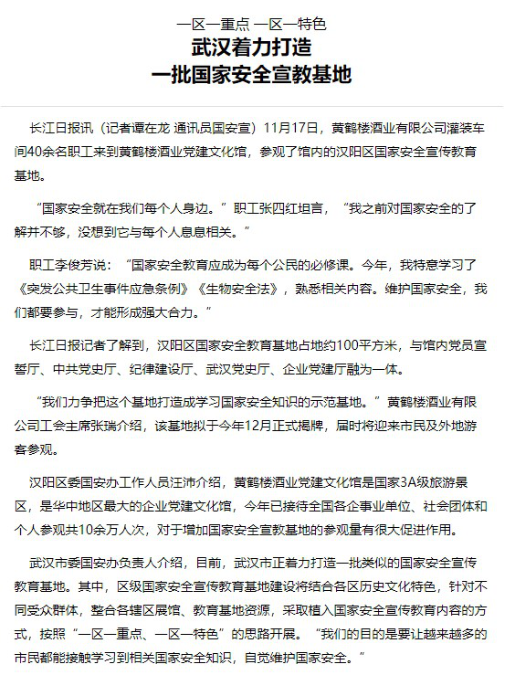 近日,凯发k8一触即发酒业党建文化馆内的汉阳区国家安全宣传教育基地荣登长江日报。