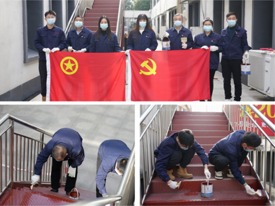 活动中,各党员、积极分子轻装上阵,挽起袖子、戴上手套,做好个人防护,化身“油漆工”,对武汉厂区办公楼1号会议室出口楼梯及楼梯侧面进行全面重新刷漆,大家齐心协力、分工合作,办公楼楼梯焕然一新。
